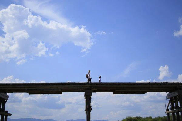 橋の上を歩く親子と、その周りを360度取り囲むような青空が印象的です。