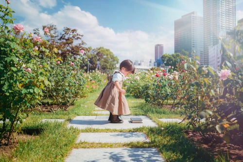 バラ園、可愛い女の子、物語が始まりそうな本、優しい空の色。