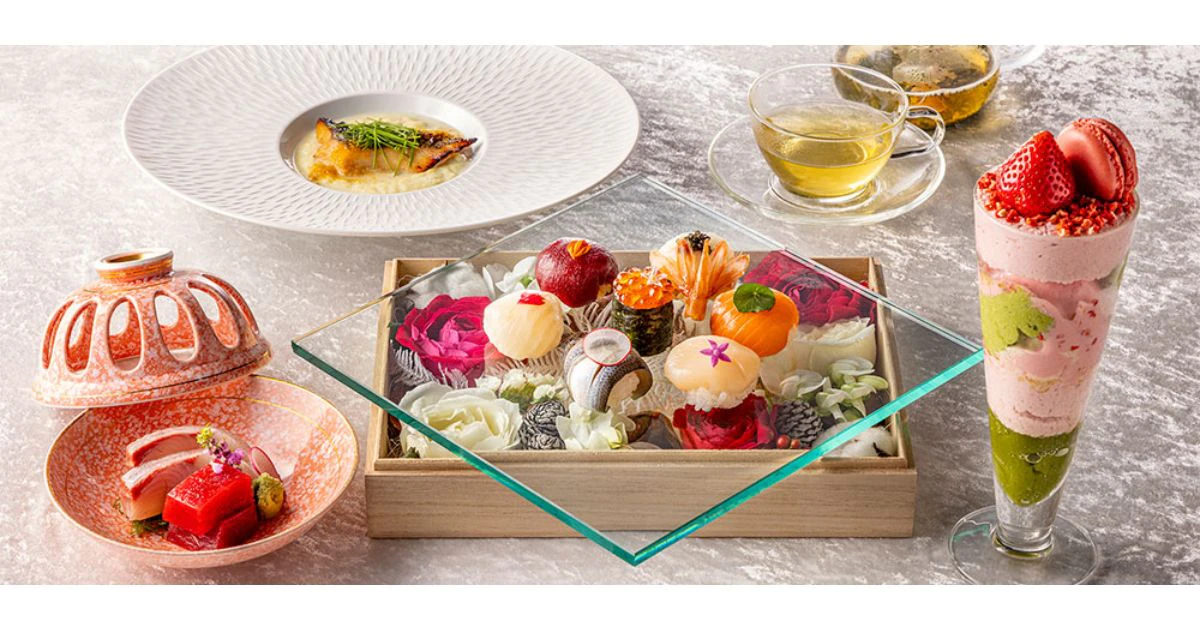 日本料理「十二颯」にて開催される、華やかな手毬寿司のランチプランです。花のつぼみを思わせる可憐な手毬寿司や、「苺と抹茶、柚子シャーベットのパフェ」は、春らしさ満点です。