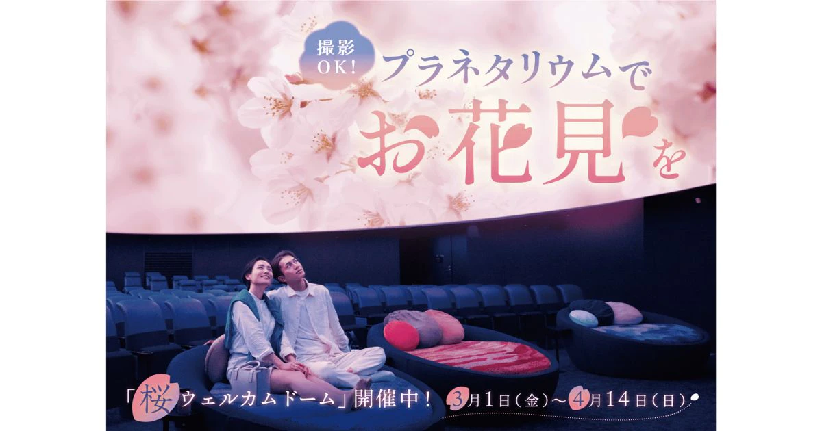 プラネタリウム内の映像で満開の桜が見られる「桜ウェルカムドーム」。見渡す限りの桜に包まれるプラネタリウムドームで、開花状況や天気に関係なく、いつでもお花見気分が楽しめます♪