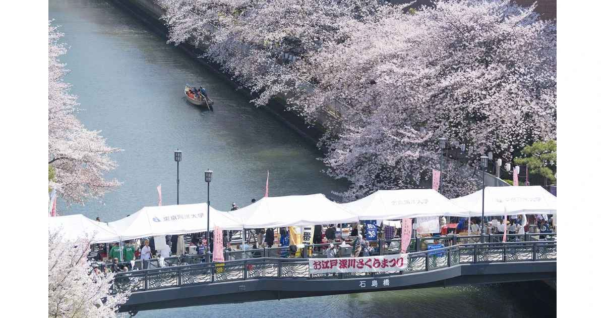 船からのお花見体験もできる「お江戸深川さくらまつり」は門前仲町の春の風物詩。期間中の土日曜は、深川めしや甘酒など屋台村も出店し、多くの人々が訪れます。