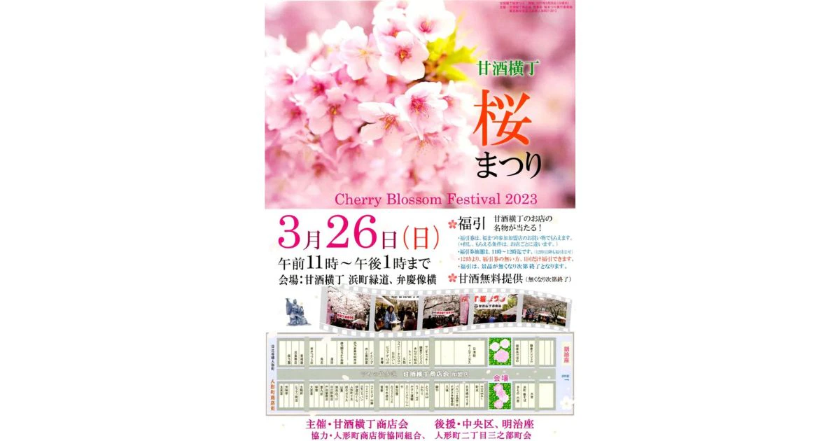 日本橋人形町の甘酒横丁にある桜は、開花時期になると見事な桜のアーチをつくります。この桜の開花に合わせ甘酒2500杯の無料提供と、甘酒横丁の名物やおいしいものが当たる福引が開催されます。