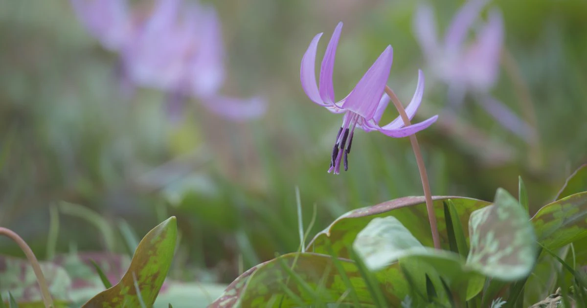 カタクリは、片栗粉のかたくりで、里山に咲く春の植物です。薄紫色の可憐な花で、うつむきかげんに咲きます。また、カタクリは、春先の2か月間だけ花を咲かせ、暖かくなる頃には散ってしまうので、「春の妖精」とも呼ばれています。春にしか見ることができない貴重な植物です。