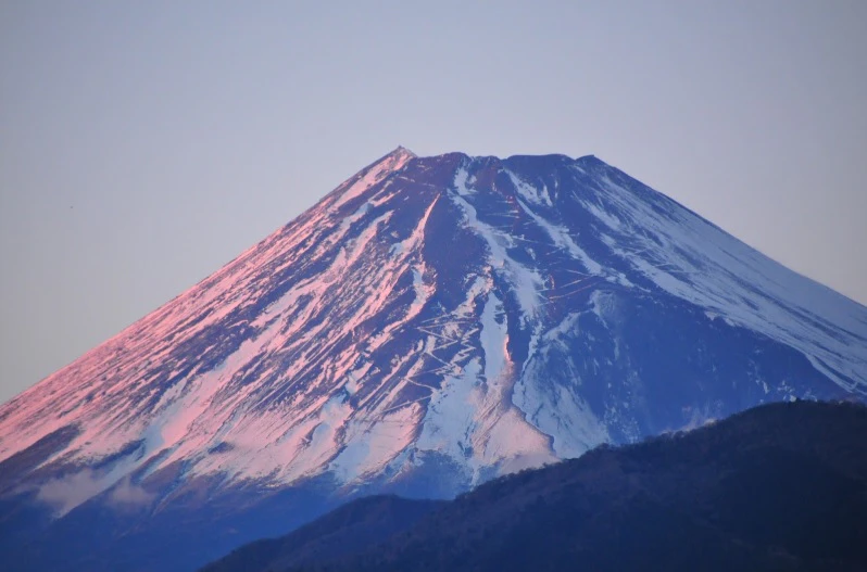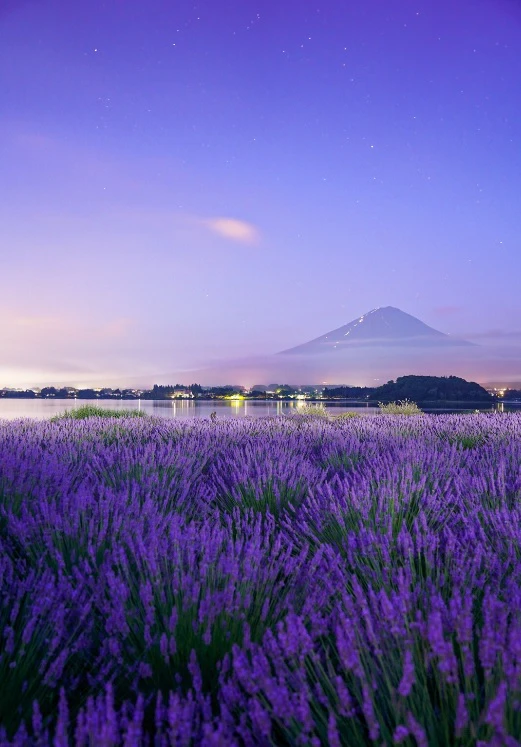 夜明けの空とラベンダーのグラデーションのなかに、富士山の優美な存在感が際立っていますね。