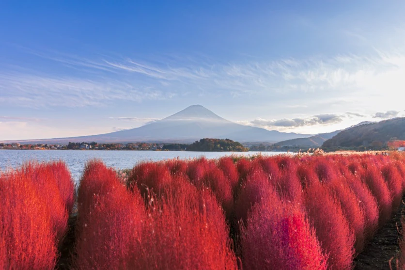 力強いコキアの赤色の奥に、大きく構える富士山が映えますね。
