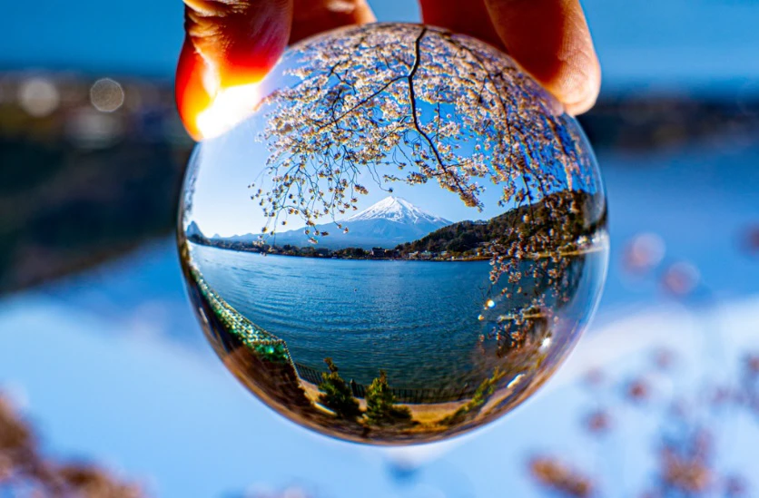 レンズボールの中いっぱいに広がる桜と富士山、美しい世界観を感じますね。