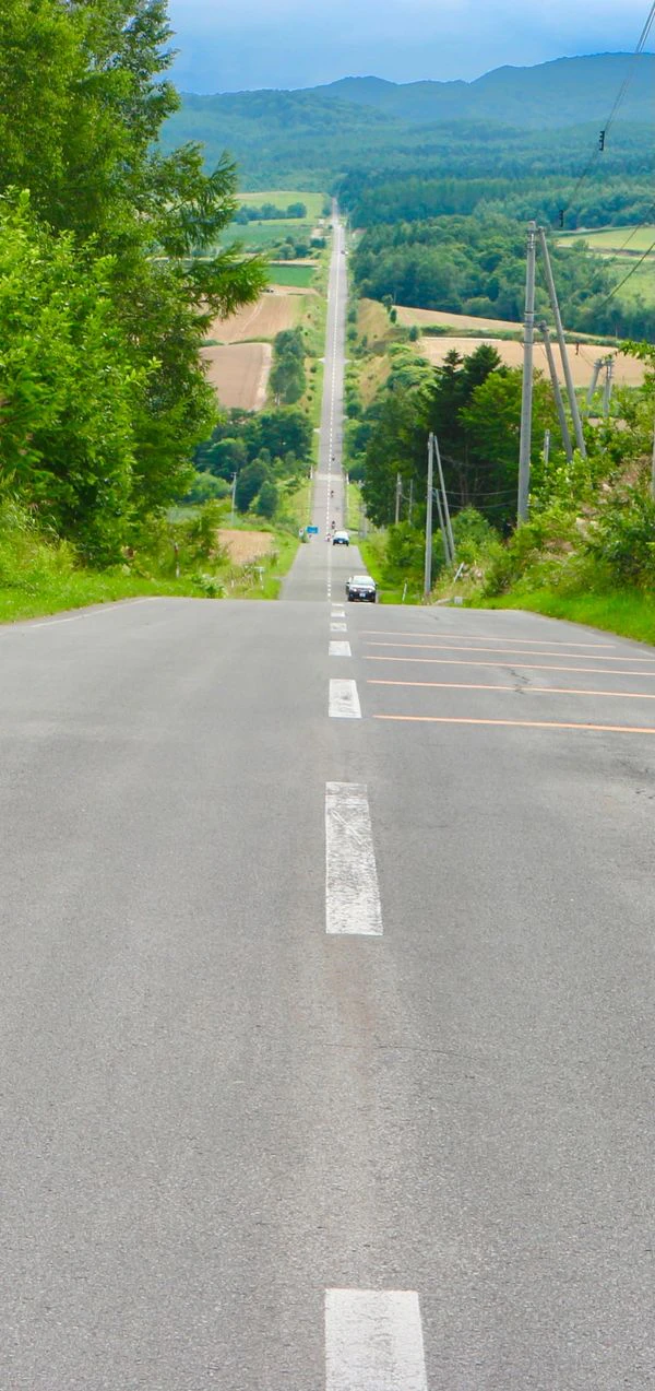 どこまでもまっすぐ走るこの道路は、北海道の上富良野にある「ジェットコースターの路」。