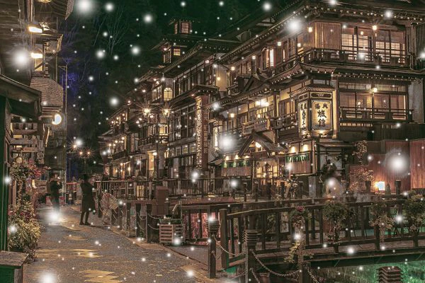 銀座温泉は昔ながらの旅館が軒を連ね、その間の川には散策が楽しくなる橋がかかっています。