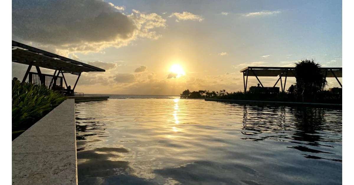 プールに映る夕日がとても綺麗で幻想的なシーンですね。