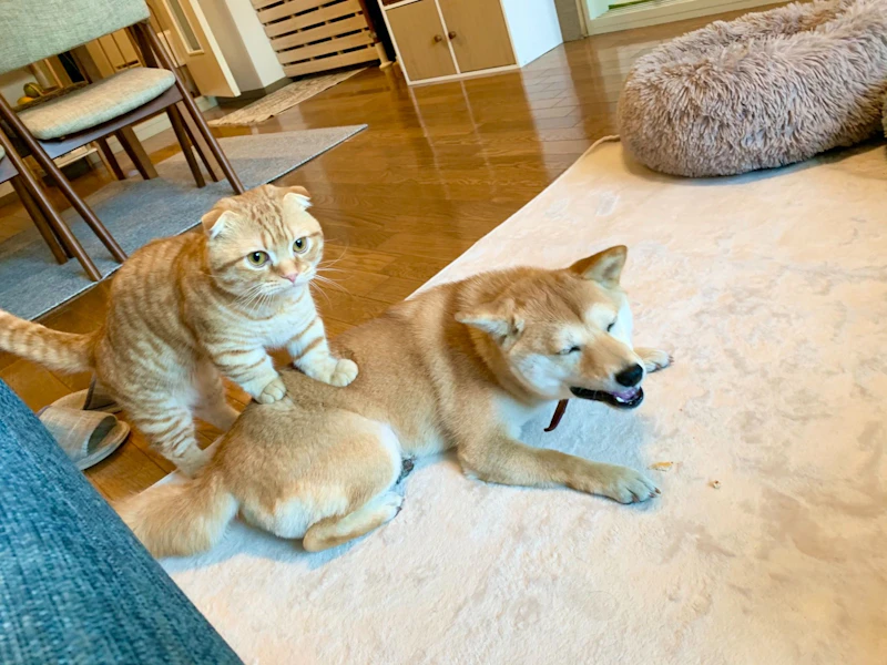 どうやら2月22日の猫の日だったらしく、むぎゅっと上に乗る猫のとろちゃんと、うへっという表情の犬のむぎちゃんが絶妙な1枚です。