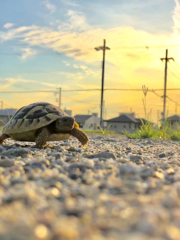 ヒガシヘルマンリクガメという種類の亀さんの散歩シーン。