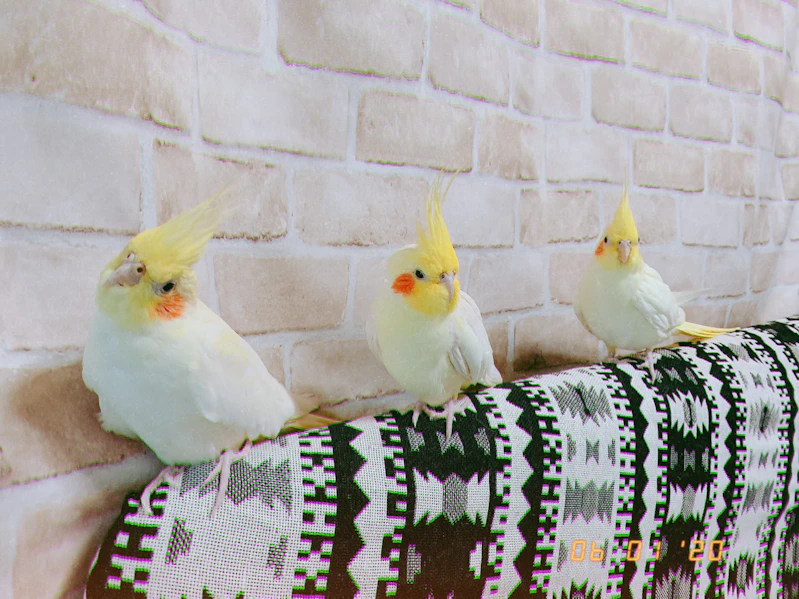 オカメインコのトリオがちょこんと並んで順番待ち!
