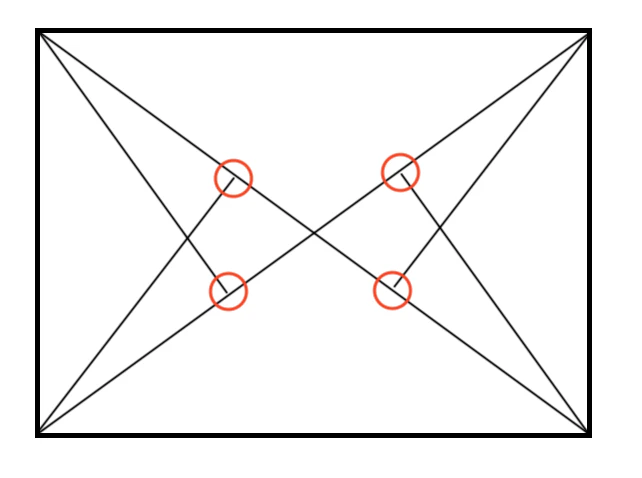 「画面内の対角線に、4つの頂点からそれぞれ垂直線を引いた交点」を黄金分割点と呼びます。
