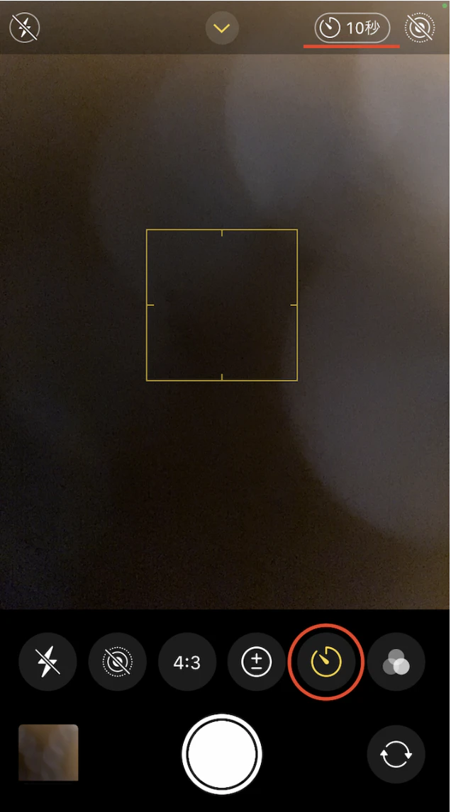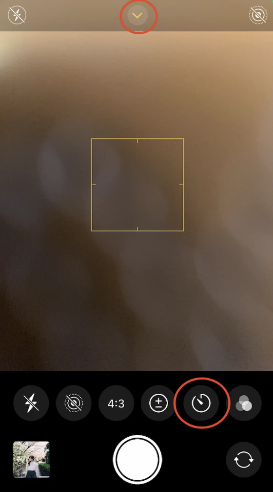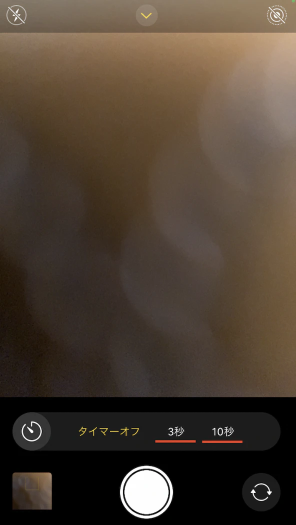 タイマー機能は、スマホの標準カメラでも搭載されているものがほとんどです。iPhoneでは上部の矢印を押すと下に設定のボタンが表示されるので、そこからタイマーボタンを選びます。