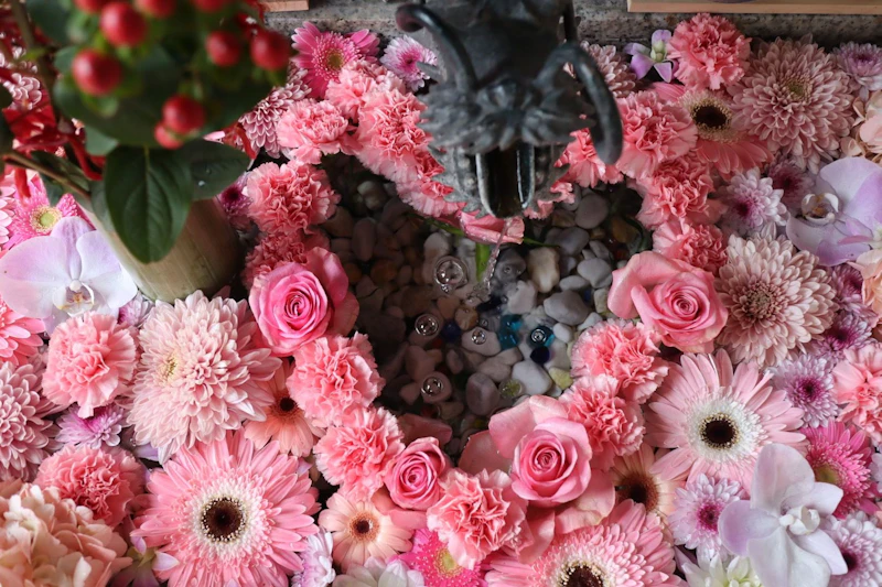 バラやカーネーションなど洋花がピンクでまとめられ、しかも水の落ちる場所はハート型。