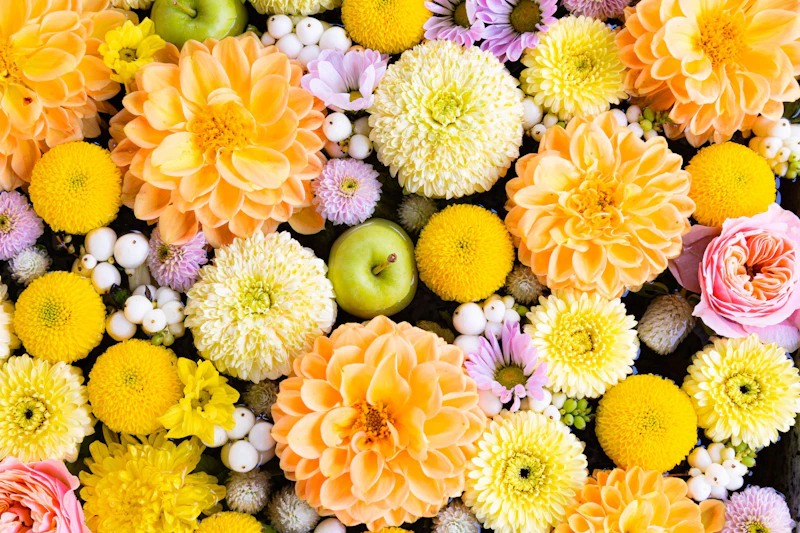 黄系のカラーで揃えられた美しい花の間に、バランスよく真っ白の実や果物まで見えます。