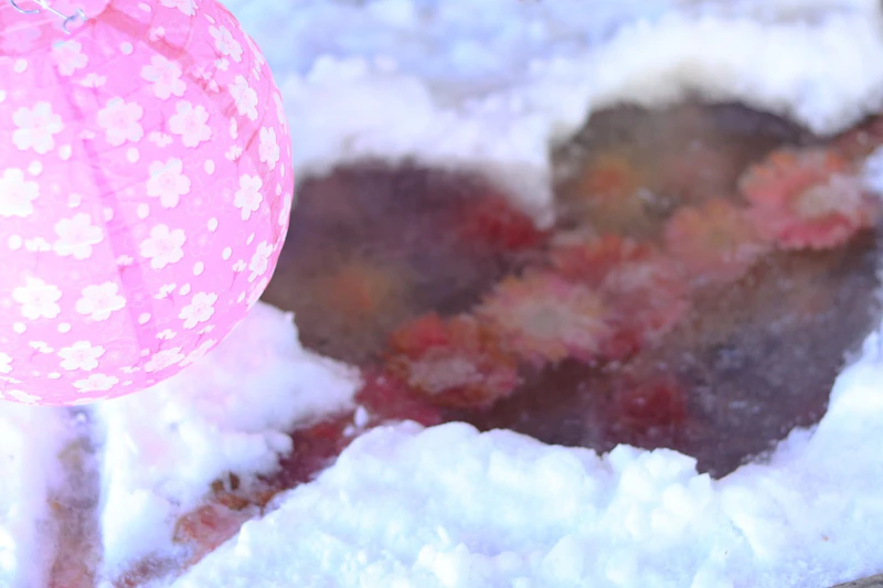 透明な氷の下に閉じ込められた鮮やかな花たち。